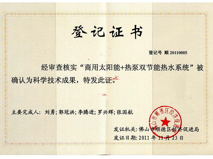 獲得“商用太陽能+熱泵雙節(jié)能熱水系統(tǒng)”科技成果獎